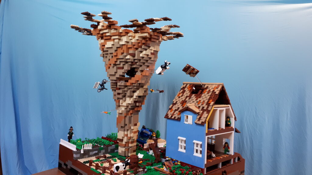 I built this Tornado for the upcoming Worlds of Wonder exhibit at The Museum of Surrey. One of the themes in Wonders of the Natural World, including Tornadoes. A few VLC members remembered my whirlpool and figures I was the right person for this build. True! I like big moving builds. And while similar, I think this was harder, because I didn’t have a custom table supporting the top edge. Anyway, here goes!
